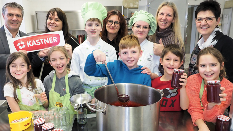 Beim Projekt Children Charity Cooking verarbeiten Kinder übrig gebliebene Lebensmittel der Firma Kastner in der Küche der HLM Krems zu gesunden Speisen. Dabei lernen sie, dass es mehr gibt als Fast Food – und dass nachhaltiges Kochen Freude macht. Mit dem Verkauf der eingekochten Köstlichkeiten konnte nun die erste Spende von 2.000 Euro an eine Familie in Droß übergeben werden.
